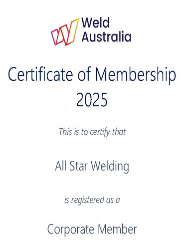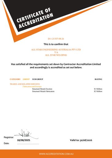 All Star Welding is actively progressing toward certification and currently works in accordance with ISO 3834-3, AS/NZS 5131, and ISO 9001 requirements as part of our commitment to quality, safety, and compliance.